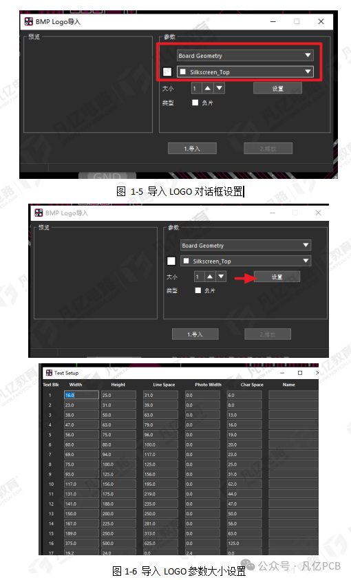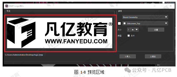 3、在导入LOGO对话框内,一般推荐是将LOGO放置在PCB的丝印层,那么对应设置按照下图1-5所示。“大小”设置按照自己的设计需求进行选择即可,或者也可以点击“设置”按钮手动输入该LOGO导入的参数大小如下图1-6所示。