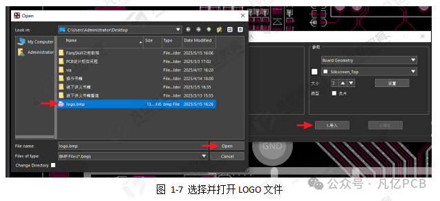 4、“类型”选项中推荐不勾选“负片”,因为LOGO导入层一般为PCB设计中的丝印层为正片,所以不推荐勾选。设置完成之后点击“导入”选项,在弹出的对话框内将LOGO单色位图的BMP格式文件手动选择并打开如下图1-7所示。