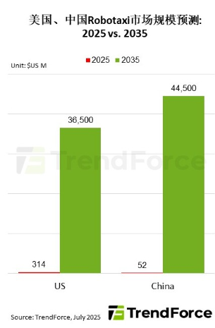 Tesla(特斯拉)正在美国德州测试其自驾出租车(Robotaxi)技术,并有意拓展服务至旧金山湾区,引发业界关注。TrendForce集邦咨询表示,美国的Robotaxi市场将由Tesla和Waymo主导,预估规模将于2035年达365亿美元。中国的Robotaxi产业正蓬勃发展,得益于完善的供应链体系,硬件成本将会快速降低。