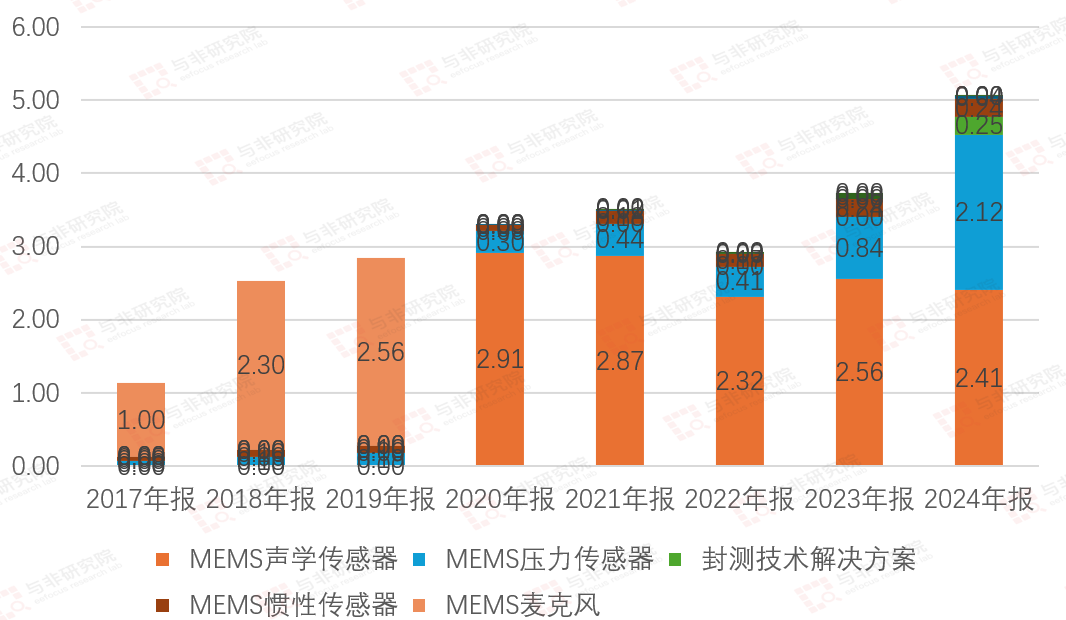 2017-2024年,公司MEMS麦克风后称为MEMS声学传感器营收由1亿元提升至2.91亿元顶峰后降低至2.41亿元;2020-2024年MEMS压力传感器由0.3亿元提升至2.12亿元;2024年封测技术解决方案贡献0.25亿元,MEMS惯性传感器贡献0.24亿元。
