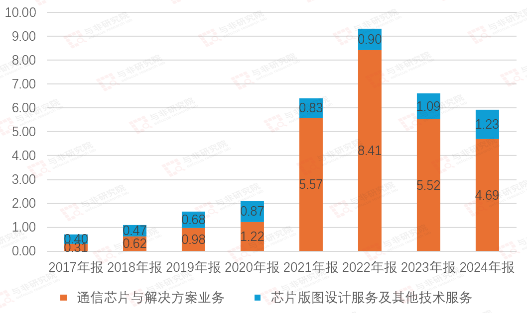 2017-2024年,通信芯片及解决方案由0.31亿元提升至8.41亿元高峰,后回落至4.69亿元,芯片版图设计服务及其他技术服务由0.40亿元提升至1.23亿元。