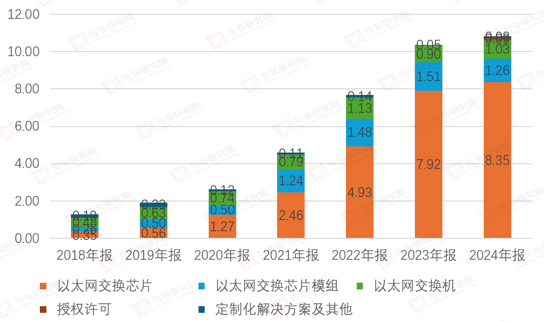2018-2024年,公司以太网交换芯片由0.35亿元提升至8.35亿元,以太网交换芯片模组由0.25亿元提升至1.26亿元,以太网交换机由0.40亿元提升至1.03亿元,授权许可和定制化解决方案占比较低。
