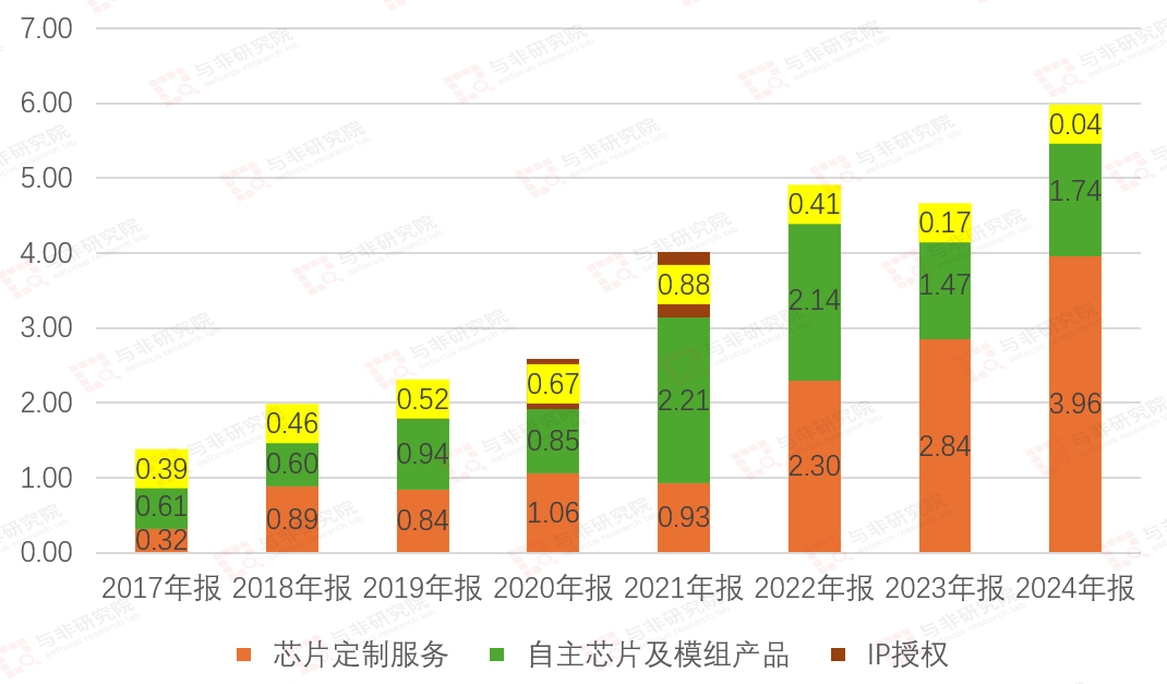 2017-2024年,公司芯片定制服务收入由0.32亿元提升至3.96亿元,自主芯片及模组产品收入由0.61亿元提升至1.74亿元,IP授权由0.39亿元提升至0.88亿元顶峰,后降低至0.04亿元。