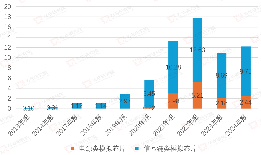 2013-2024年,信号链芯片占比最大,由0.10亿元提升12.63亿元高峰,后降低至9.75亿元。2020年,电源管理芯片开始贡献收入,2020-2024年由0.22亿元提升至2.44亿元。