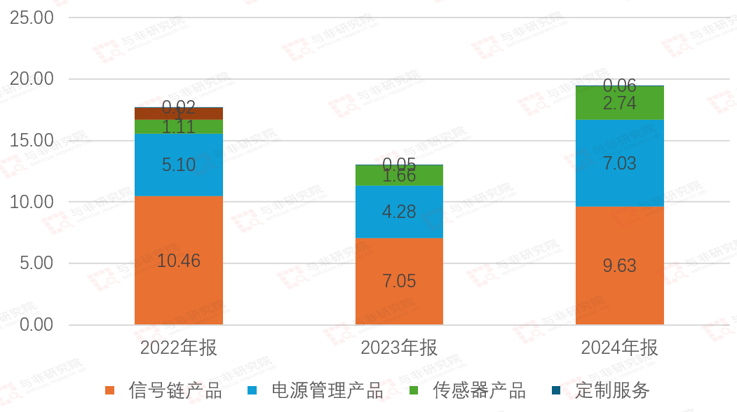2022-2024年,公司信号链产品先由10.46亿降低至7.05亿元,后又提高至9.63亿元;电源管理产品由5.10亿元降低至4.28亿元,后又提升至7.03亿元,传感器产品由1.11亿元提升至2.74亿元,定制服务占比较小。