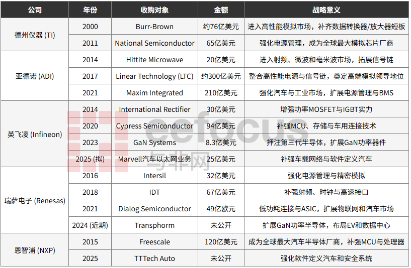 2014年收购International Rectifier补强MOSFET;2020年以94亿美元并购Cypress切入MCU与车用连接;2023年收购GaN Systems布局第三代半导体;2025年拟收购Marvell汽车以太网业务。