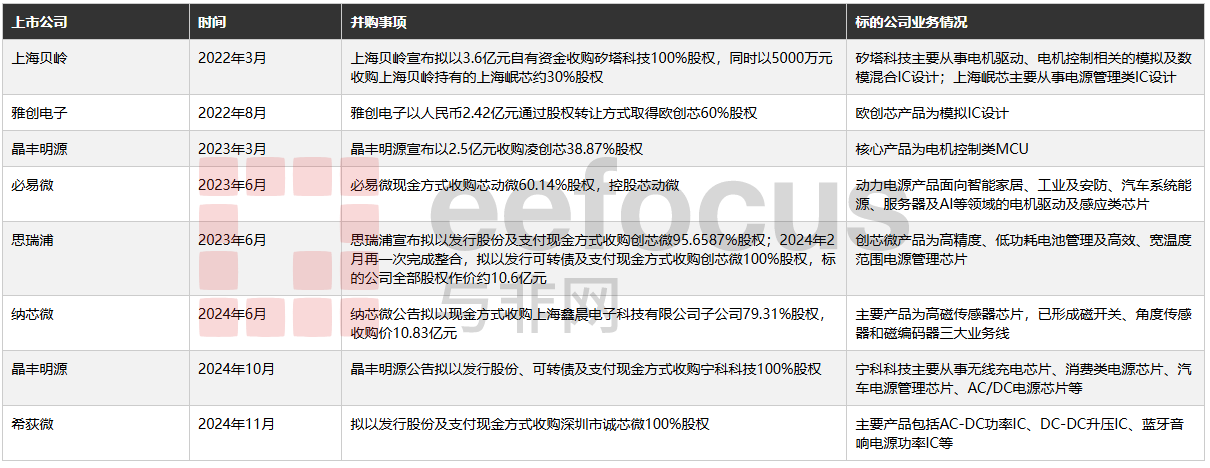 随着IPO监管趋严,不少中小规模的模拟芯片团队上市门槛增加,处于尴尬境地,不少企业通过并购补齐短板或“曲线”登陆A股市场。2024年以来,A股市场已披露数十起并购案例,涉及电源管理、信号链、MCU与嵌入式处理器等多个细分方向。