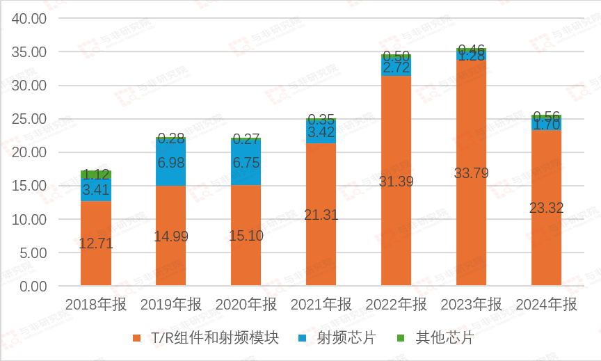 南京国博电子股份有限公司的主营业务是有源相控阵T/R组件和射频集成电路相关产品的研发、生产和销售。公司的主要产品是T/R组件和射频模块、射频芯片。