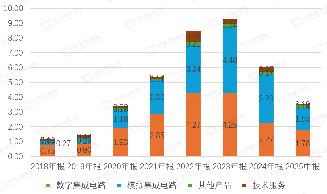 2018-2023年数字集成电路由0.75亿元提升至4.25亿元,模拟集成电路由0.27亿元提升至4.48亿元;2024年出现一定的下降,分别为2.27亿元和3.29亿元;2025H1分别为1.78亿元和1.53亿元,其他产品和技术服务金额较低。