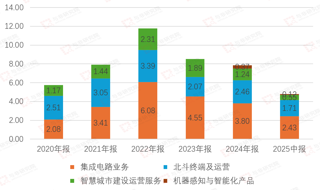 2025H1集成电路业务、北斗终端及运营、智慧城市业务分别为2.43亿元、1.71亿元、0.55亿元。