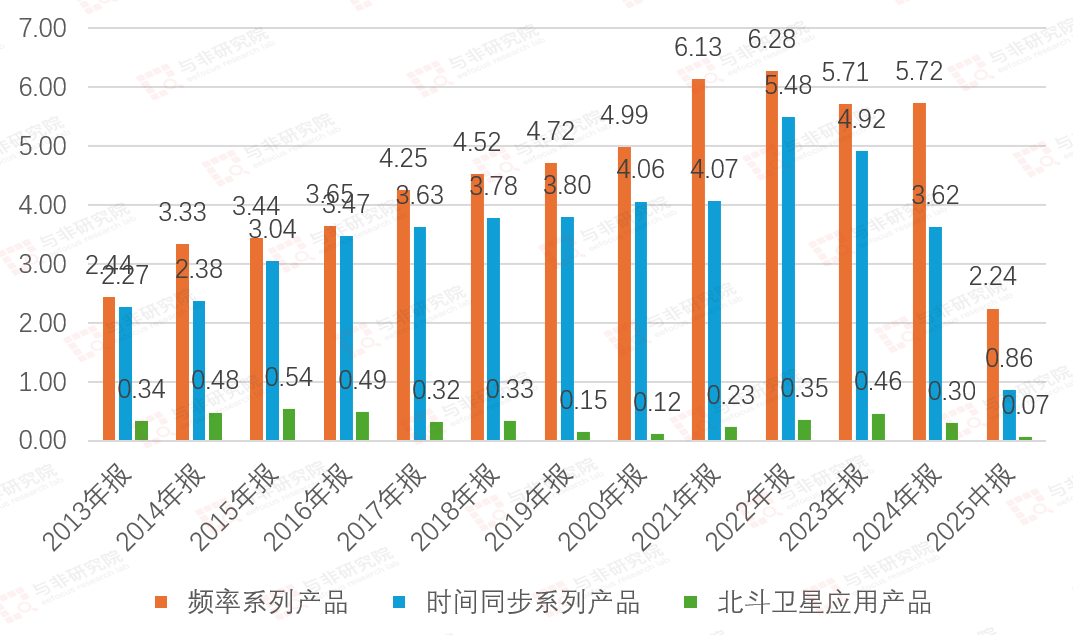 2013-2022年频率系列由2.44亿元提升至6.28亿元顶峰,2023-2024年降低为5.71亿元、5.72亿元;2013-2022年时间同步系列产品由2.27亿元提升至5.48亿元顶峰,2023-2024年降低至4.92亿元、3.62亿元;2013-2024年,北斗卫星应用产品在0.12-0.54亿元震荡,变化不大。2025H1分别为2.24亿元、0.86亿元、0.07亿元。