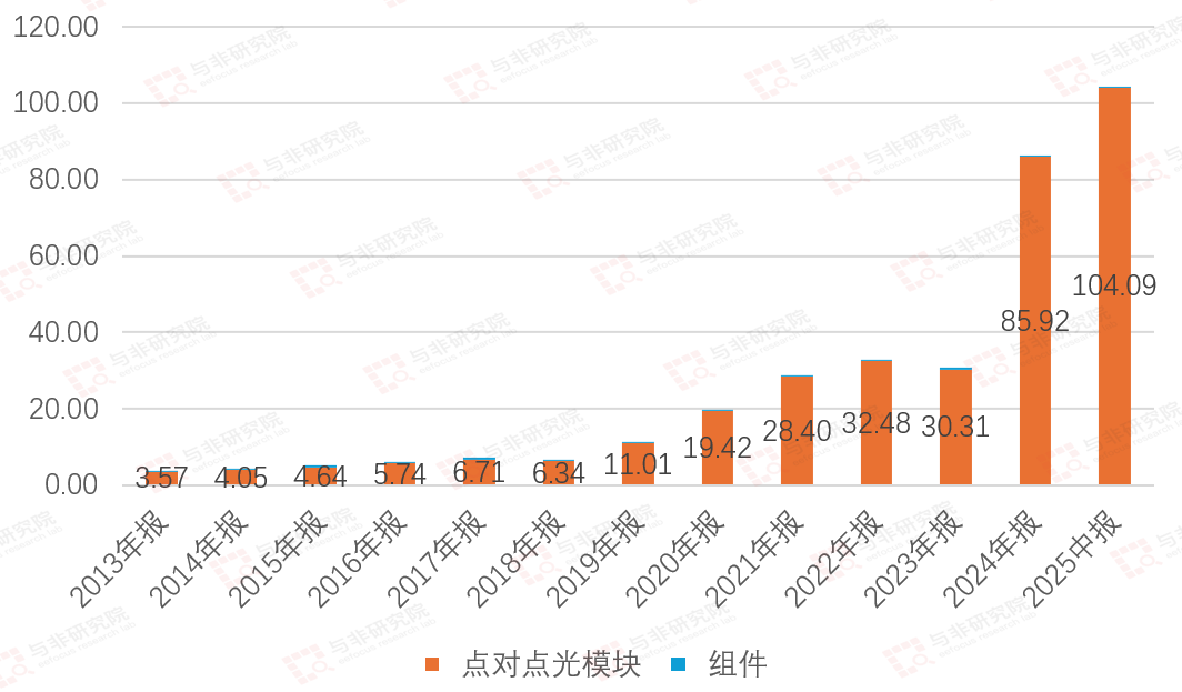 2013-2025H1,公司点对点光模块由3.57亿元提升至104.09亿元,2025H1已超过2024年全年,增速强劲。