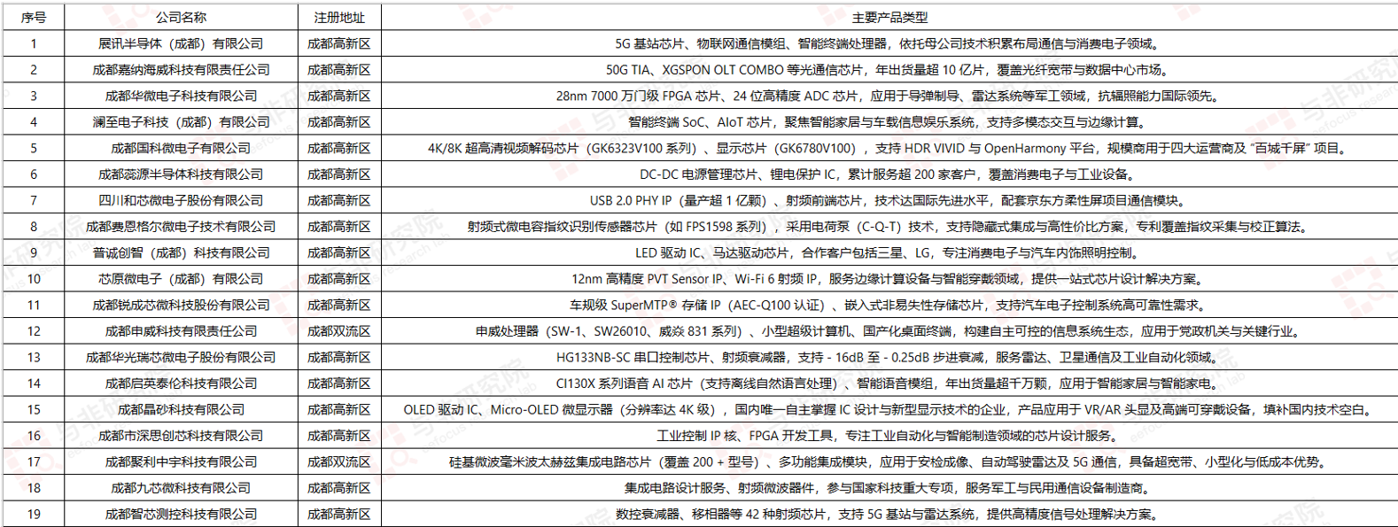 成都已初步形成 IC 设计、晶圆制造、封装测试、装备材料联动协同的产业链,汇集英特尔、德州仪器、成都华虹、成都海光等上下游企业200余家,在高端处理器技术、射频微波技术、北斗导航技术等领域的高端芯片研发具有特色优势。