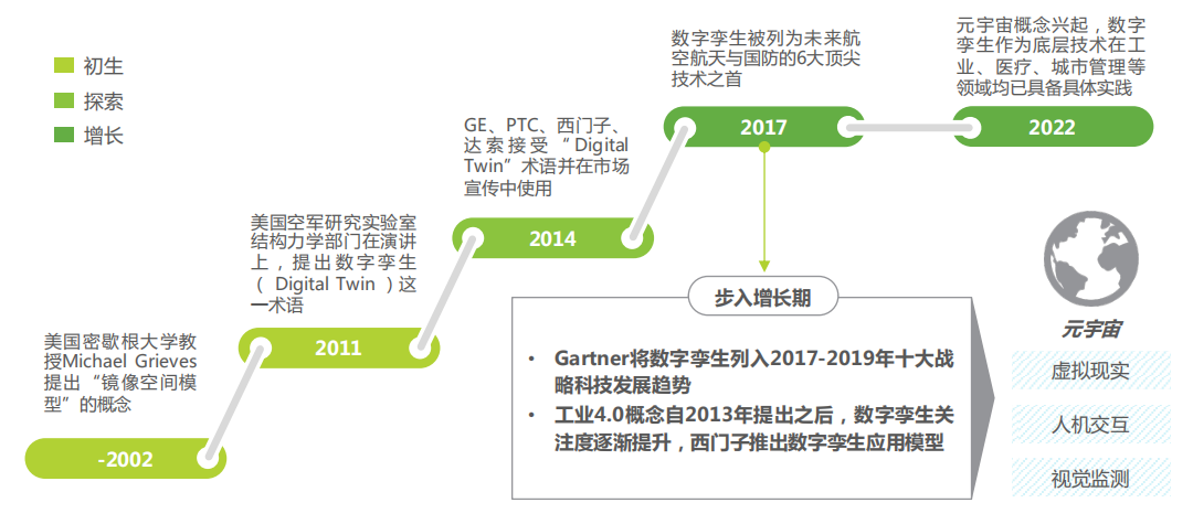 数字孪生的概念起源可以追溯至20世纪60年代,当时美国国家航空航天局(NASA)首次在其阿波罗计划中引入了“孪生”概念。这一概念涉及在地球上创建物理复制品,这些复制品能够精确匹配它们在太空中的系统。这使得他们能够模拟各种场景,测试不同的情况和条件,并评估其系统的行为和性能。然而,这一概念直到21世纪初迈克尔·格里夫斯在制造业中引入数字孪生的概念后才真正获得广泛关注。随后,在2017年,高德纳将其列为十大战略技术趋势之一,许多行业巨头采纳了这一概念,从而获得了更多的关注和重视。