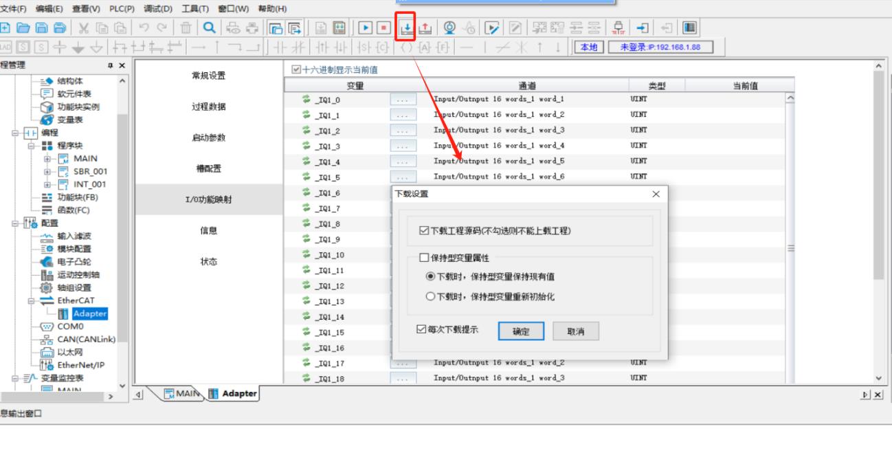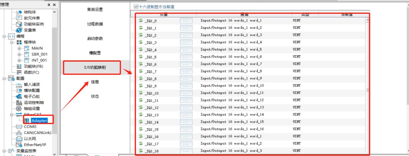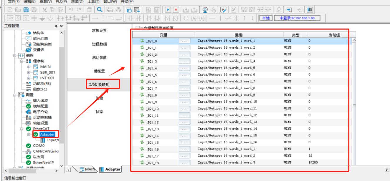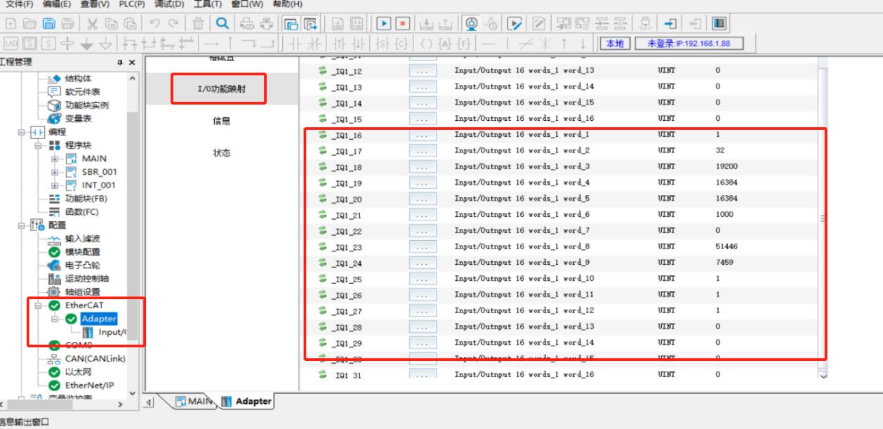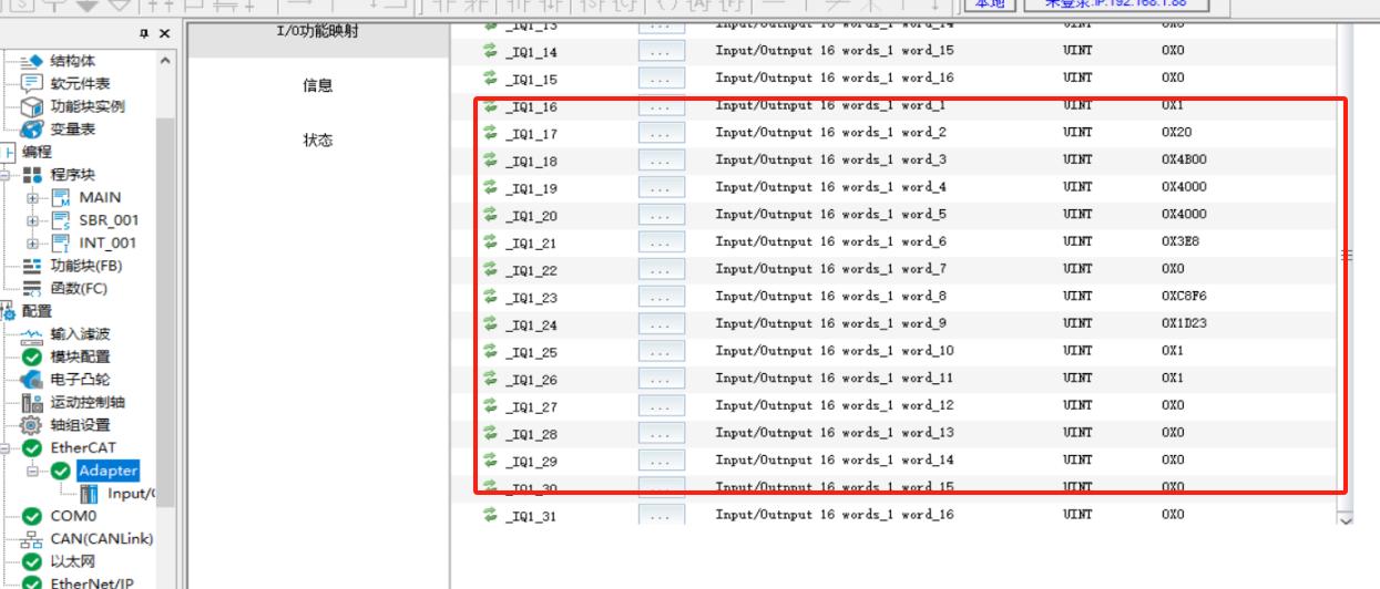 打开“EtherCAT的 I/O映射”,可以监控输入输出区的数值,十六进制数据格式如下图所示:
