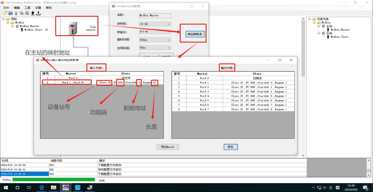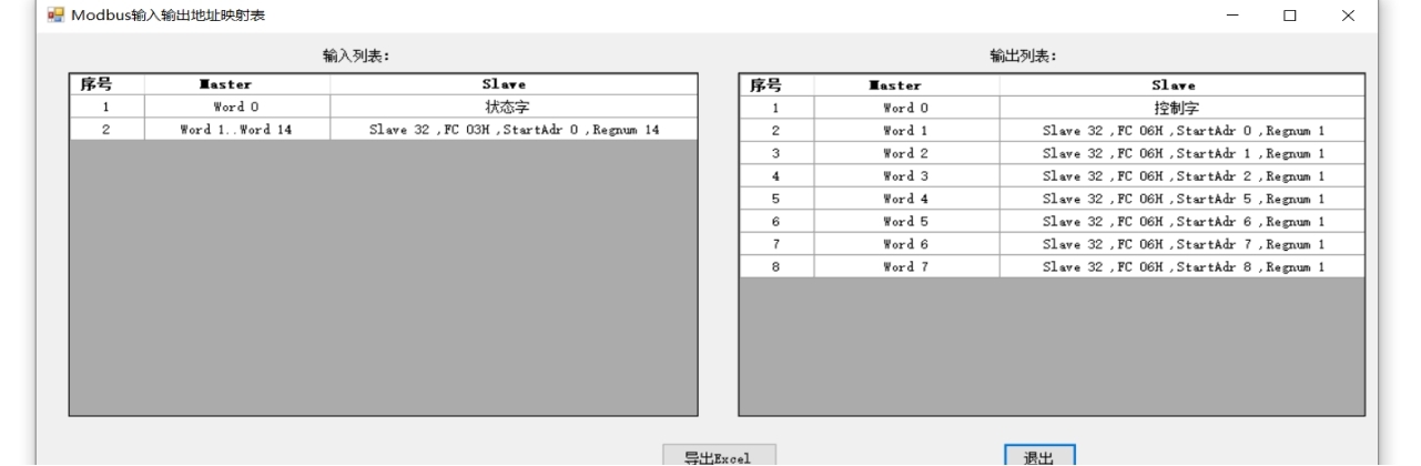 双击“Modbus Master”,然后点击“地址映射表”,查看所有地址寄存器。这里除了从站的寄存器之外,还有一个状态字和控制字,因此,输入有14个字,输出有8个字。如下图所示: