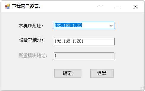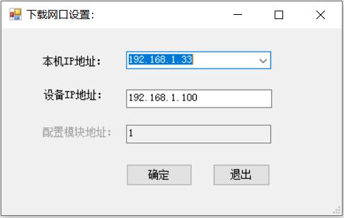 在弹出的窗口中选择本机电脑网卡即本机IP地址,连接网关P1口,并输入网关即设备IP地址(这里是192.168.1.100),点击确认按钮。注意,计算机网卡地址和网关地址要在同一网段。