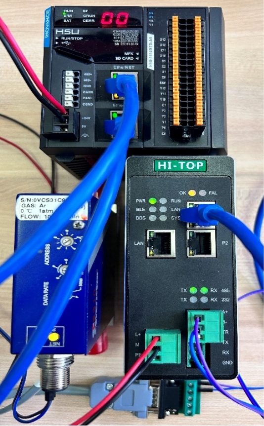 解决方法:使用HI-TOP网关 HT3S-ECS-MDN。汇川H5U-A8支持EtherCAT协议,七星华创CS310流量计支持Modbus RTU协议,而HI-TOP网关?HT3S-ECS-MDN可以在EtherCAT网络和Modbus RTU网络之间传送数据。以下为测试环境: