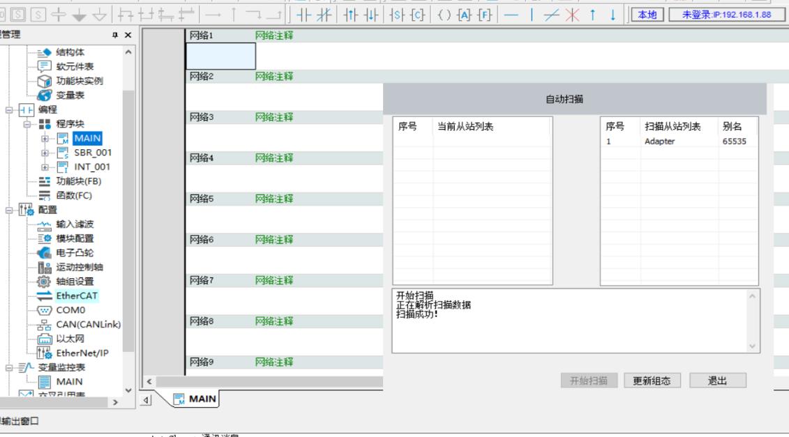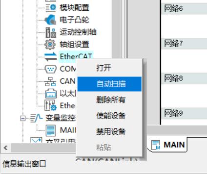 2、在左侧系统树中右键选择“EtherCAT”,在弹出菜单中选择“自动扫描”: