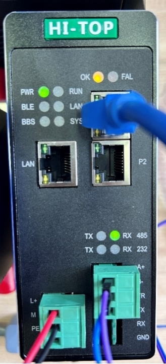 6.网关正常运行时各指示灯如下图所示,EtherCAT的OK灯亮, Modbus RTU的TX和RX灯闪烁。如下图所示: