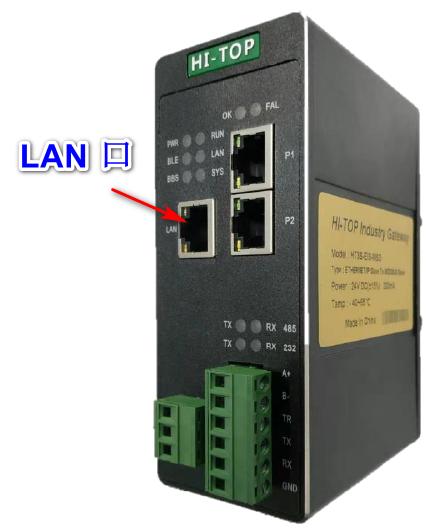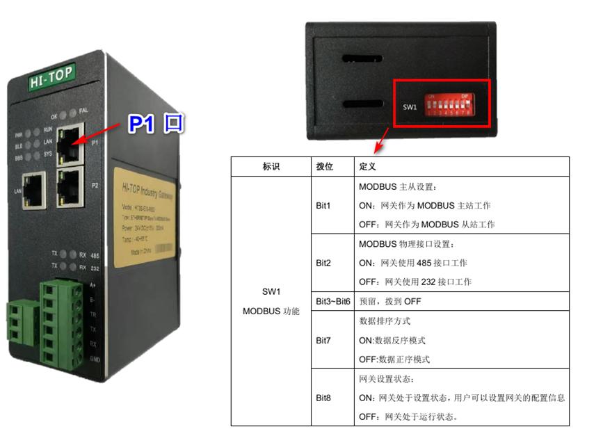 使用GW Modbus Builder连接到HT3S-ECS-MDN网关的P1口,并将拨码第8位拨到ON,如下图所示。此时网关P1口地址为:192.168.1.100。