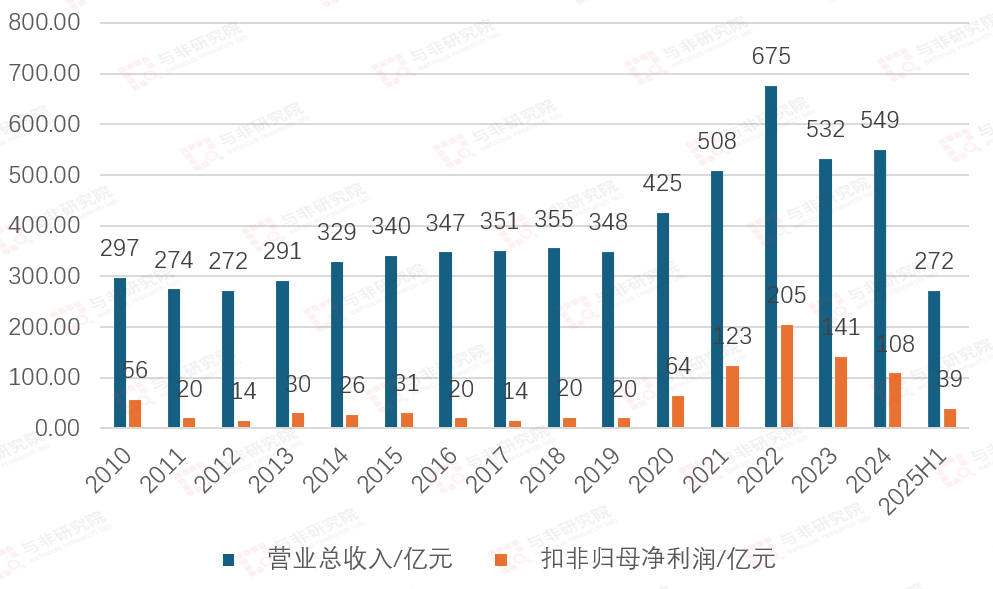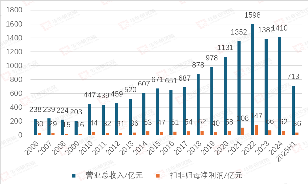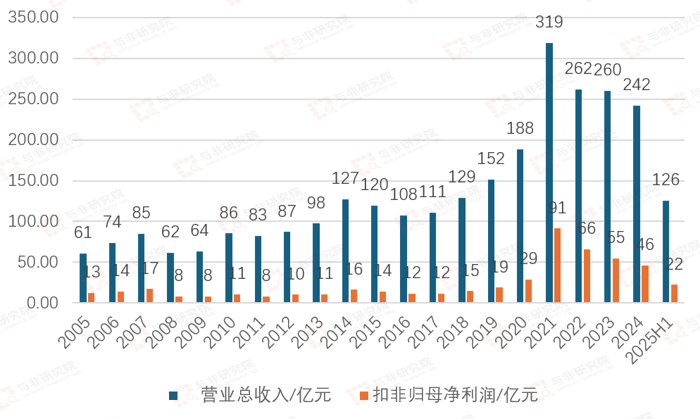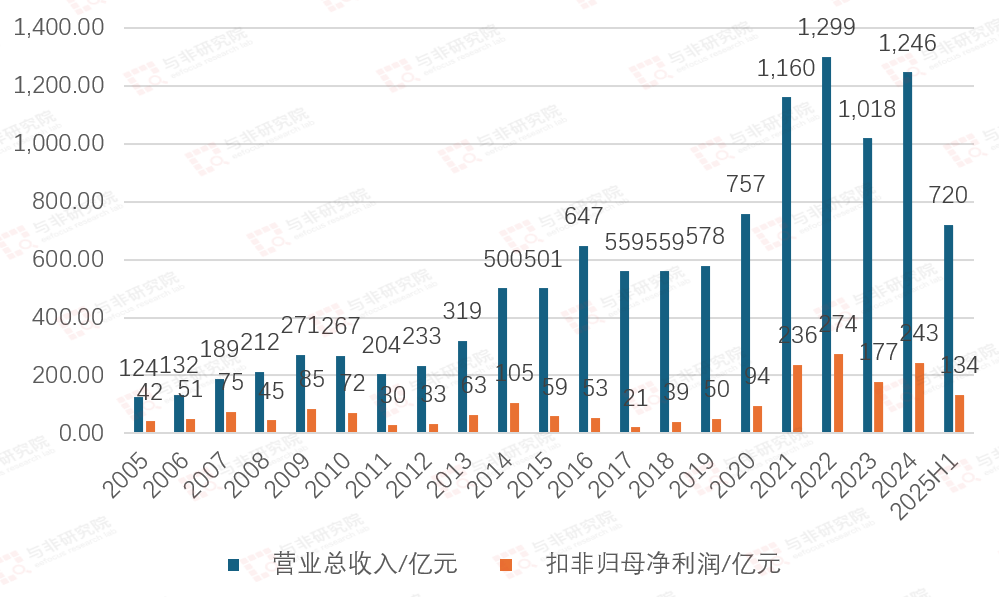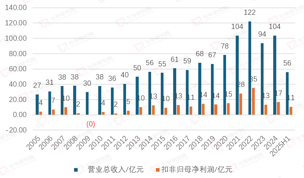 2005-2022年,公司营收由27亿元提升至122亿元高峰,扣非净利润由4亿元提升至85亿元高峰;2023年营收和扣非净利润分别降低至94亿元、13亿元,2024年营收和扣非净利润又提升至104亿元、17亿元,2025H1营收和扣非净利润分别为56亿元、11亿元。