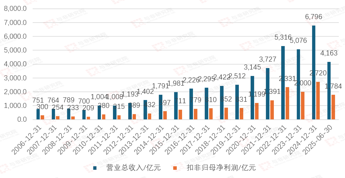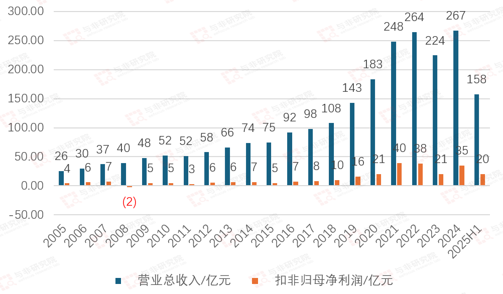 2005-2024年,公司主营收入由26亿元提升至267亿元,扣非净利润由4亿元提升至85亿元。2025H1营收和扣非净利润分别为158亿元、20亿元。