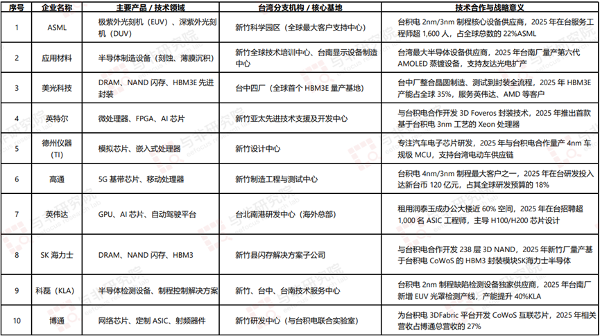中国台湾半导体产业已形成“本土龙头主导制造、国际巨头深度参与”的生态体系,ASML、应用材料等企业的技术输出与美光、SK 海力士的产能布局,共同支撑中国台湾在先进制程、先进封装、存储芯片三大领域的全球领先地位。