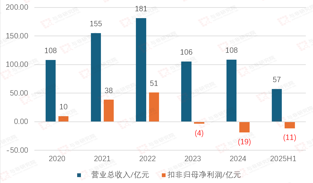 2020-2022年公司营收由108亿元提升至181亿元,扣非净利润由10亿元提升至51亿元;2023-2024年降低至106亿元、108亿元,扣非净利润为-4亿元、-19亿元。2025H1营收和扣非净利润分别为57亿元、-11亿元。