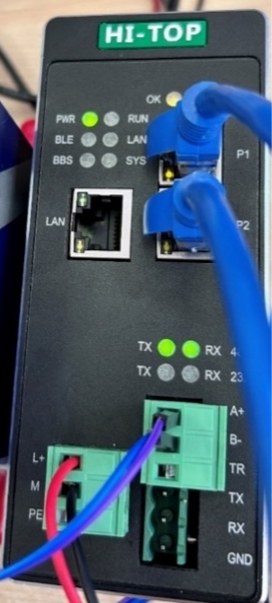 2. 连接网关P1口到西门子的Profinet网口,网关的P2连接到电脑网口。通讯线使用5口接线柱连接,网关6PIN端子的A+连接到接线柱的T/R+端口,网关6PIN端子的B-口到接线柱的T/R-端口,如图: