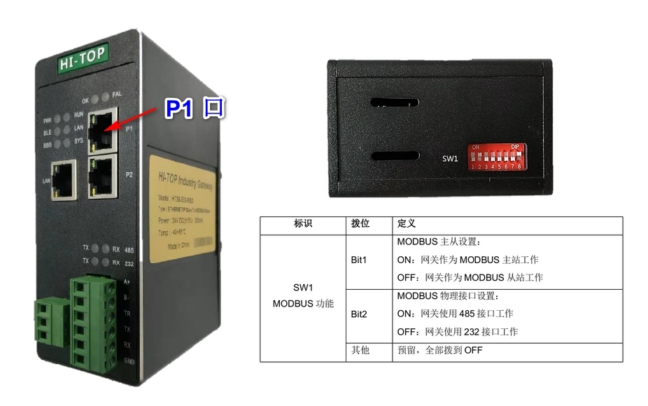 1.将西门子1200的PLC连接到HT3S-PNS-MDN网关的P1口,并将拨码第1-2位拨到ON,如下图所示。