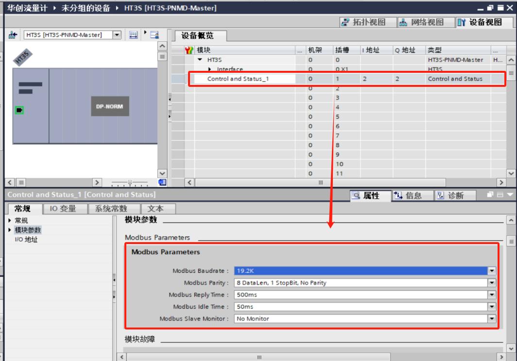 4.设置HT3S-PNS-MDN网关参数(包含MODBUS设备的波特率、发送间隔、等待应答时间、从站状态监测等信息,此处设置的参数要与流量计设备实际参数一致)。