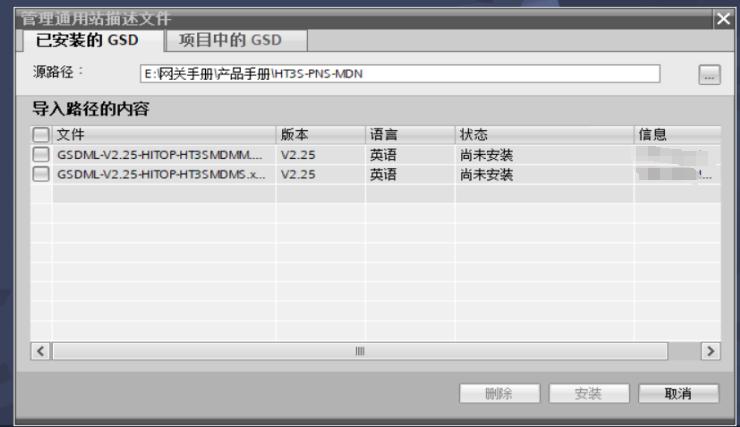 2.打开博图,新建项目,通过“选项”——“管理通用站描述文件”添加HT3S-PNS-MDN网关的GSD文件。: