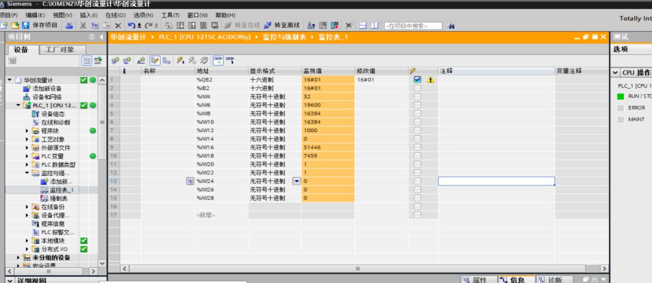 PLC编程软件TIA Portal V17创建监控表,把网关的地址进行监控,正常运行的网关在这里显示绿色的圆点,可以监控输入输出区的数值,十六进制数据格式如下图所示: