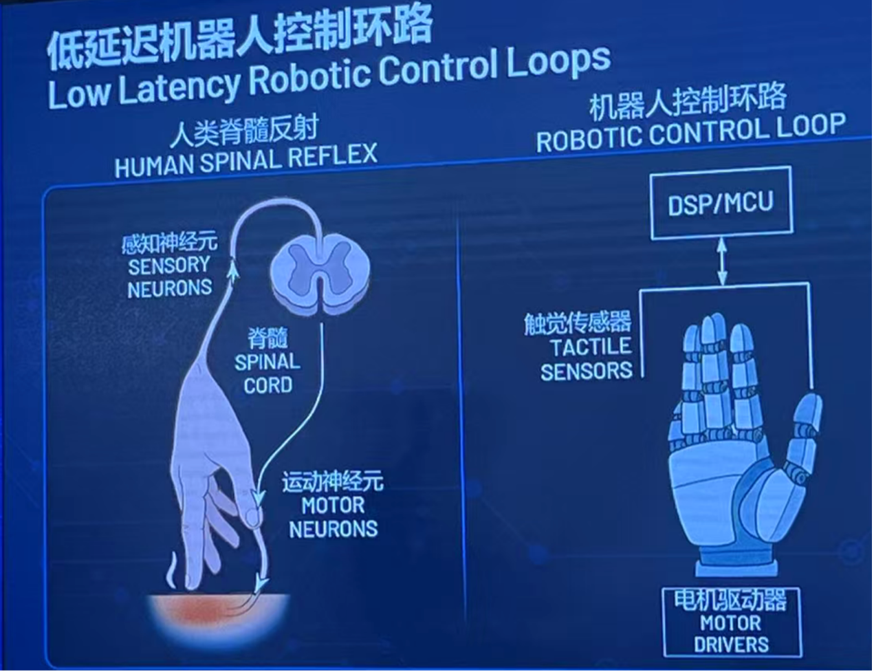 尽管前景广阔,陈宝兴也坦言,当前具身智能、物理智能成熟度有限,是产业化的主要瓶颈,而这主要在于环境认知与动态适应能力不足。他特别强调了低延迟控制的重要性——人类“脊髓反射”仅需20-50毫秒,机器人若要实现类人灵巧性,感知-处理-通信-驱动的整体环路延迟必须控制在10-20毫秒以内。