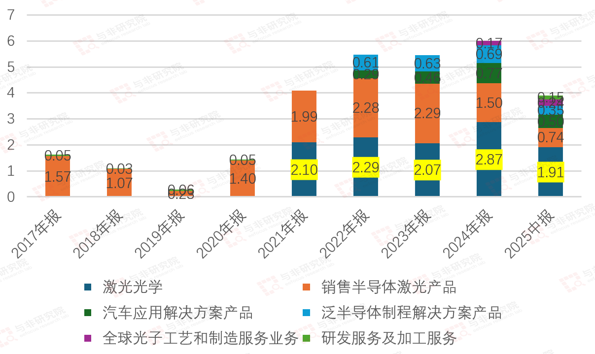 2017-2020年,公司主营销售半导体激光产品分别为1.57亿元、1.07亿元、0.23亿元、1.40亿元,研发服务及加工服务占比较少。2021-2025H1,公司营收增加激光光学业务分别为2.10亿元、2.29亿元、2.07亿元、2.87亿元、1.91亿元。汽车应用解决方案产品、泛半导体制程解决方案产品、全球光子工艺和制作服务也有增长。