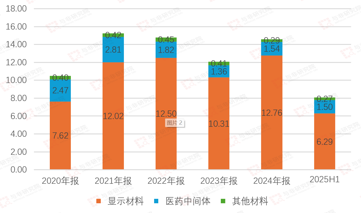 2020-2024年,公司显示材料营收分别为7.62亿元、12.02亿元、12.50亿元、10.31亿元、12.76亿元,2025H1为6.29亿元;医药中间体和其他材料次之。