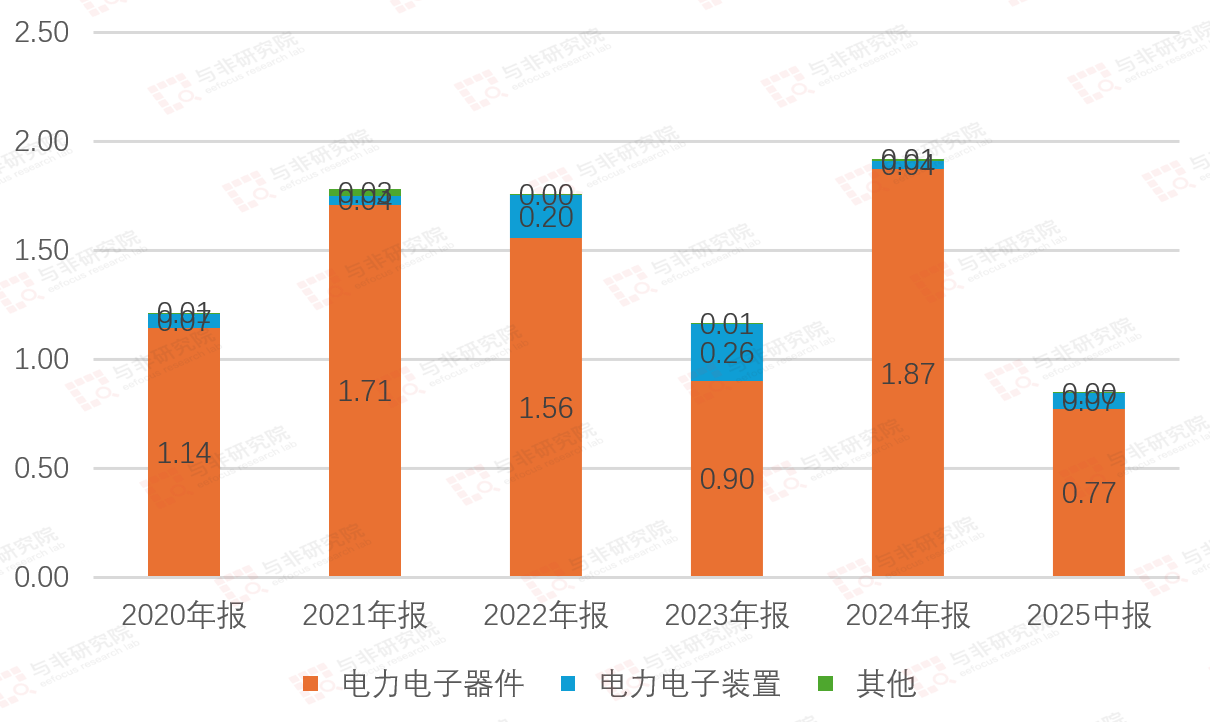 2020-2024年,公司电力电子器件营收分别为1.14亿元、1.71亿元、1.56亿元、0.90亿元、1.87亿元,2025H1为0.77亿元;电力电子装置较少,仅2023年达到0.26亿元;其他占比较低。