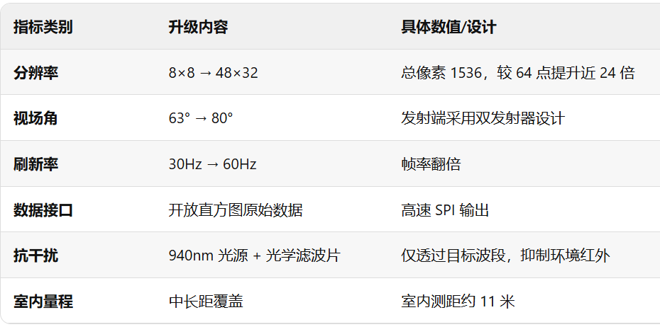 相比前代产品, TMF8829在分辨率、视场角、刷新率、数据接口以及抗干扰能力等方面实现全面升级。其研发目标聚焦在“更高性能与更稳定落地”,不仅仅追求参数的提升,更强调在复杂场景下的可靠表现。