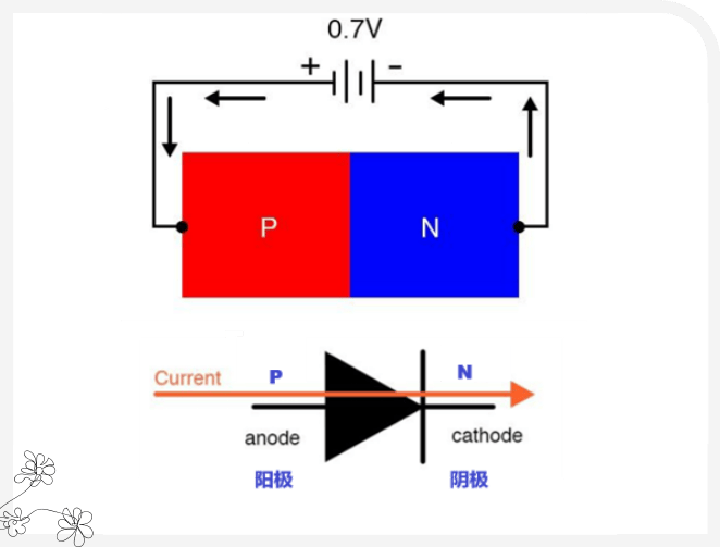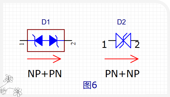 那他们本质上有区别吗?我们知道二极管是有PN结组成,如图5,电流从P极进去,N极出来,正向导通, 硅管的管压降VF为0.7V。