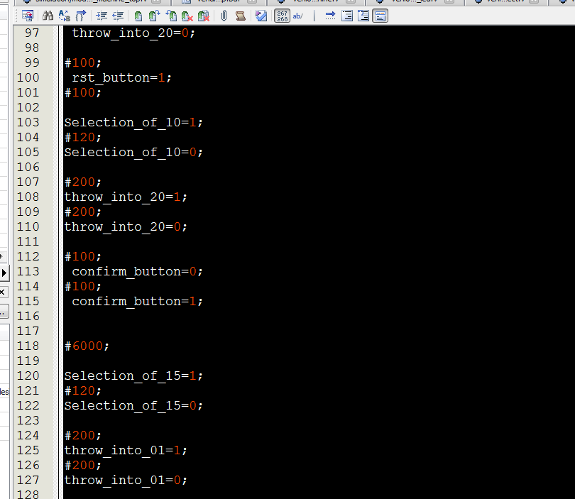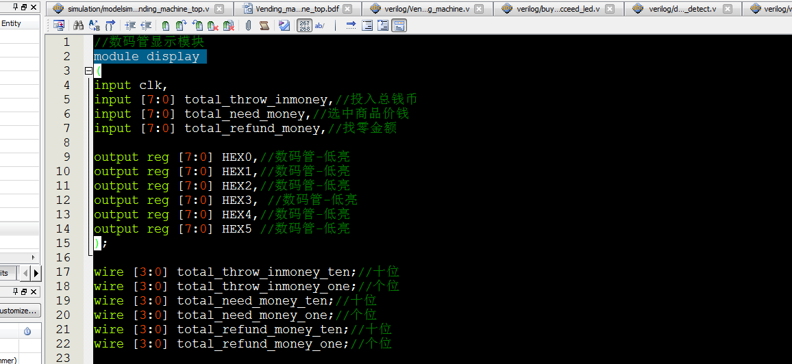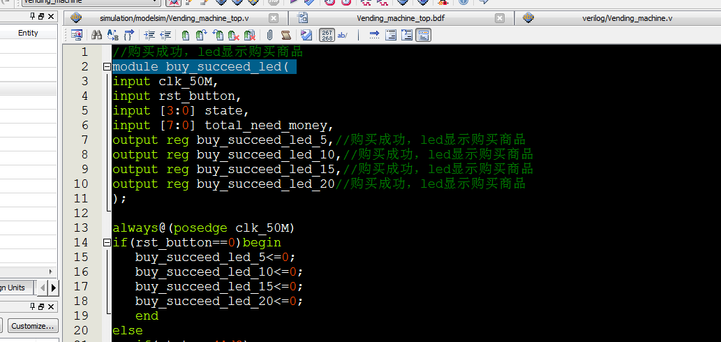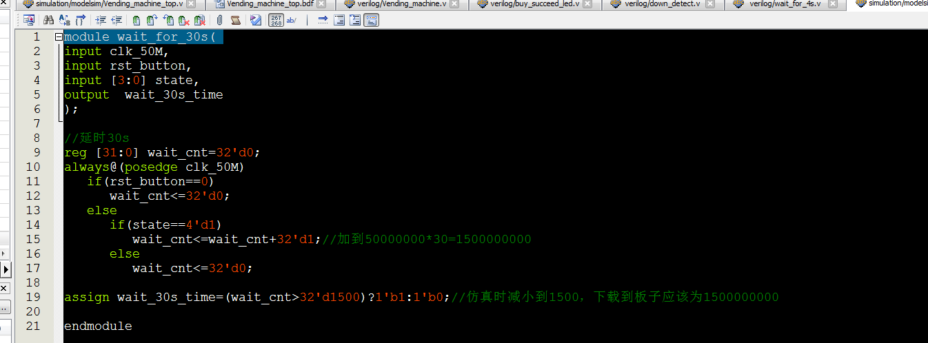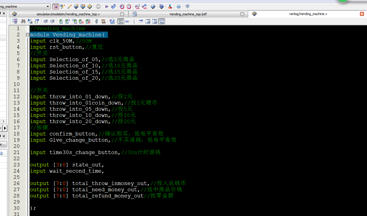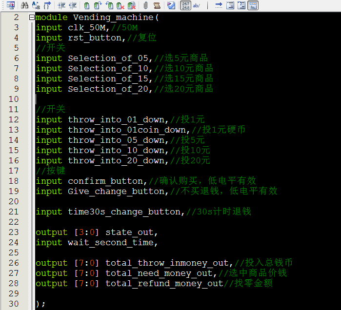 //Vending_machine module?Vending_machine( input?clk_50M,//50M input?rst_button,//复位 //开关 input?Selection_of_05,//选5元商品 input?Selection_of_10,//选10元商品 input?Selection_of_15,//选15元商品 input?Selection_of_20,//选20元商品 //开关 input?throw_into_01_down,//投1元 input?throw_into_01coin_down,//投1元硬币 input?throw_into_05_down,//投5元 input?throw_into_10_down,//投10元 input?throw_into_20_down,//投20元 //按键 input?confirm_button,//确认购买,低电平有效 input?Give_change_button,//不买退钱,低电平有效 input?time30s_change_button,//30s计时退钱 output?[3:0]?state_out, input?wait_second_time, output?[7:0]?total_throw_inmoney_out,//投入总钱币 output?[7:0]?total_need_money_out,//选中商品价钱 output?[7:0]?total_refund_money_out//找零金额 ); parameter?state_0=4'd0; parameter?state_1=4'd1;//选择 parameter?state_2=4'd2;// parameter?state_3=4'd3;// parameter?state_4=4'd4;//找零时间4秒 parameter?state_5=4'd5;//找零20元 parameter?state_6=4'd6;//找零15元 parameter?state_7=4'd7;//找零10元 parameter?state_8=4'd8;//找零5元 parameter?state_9=4'd9;//结束