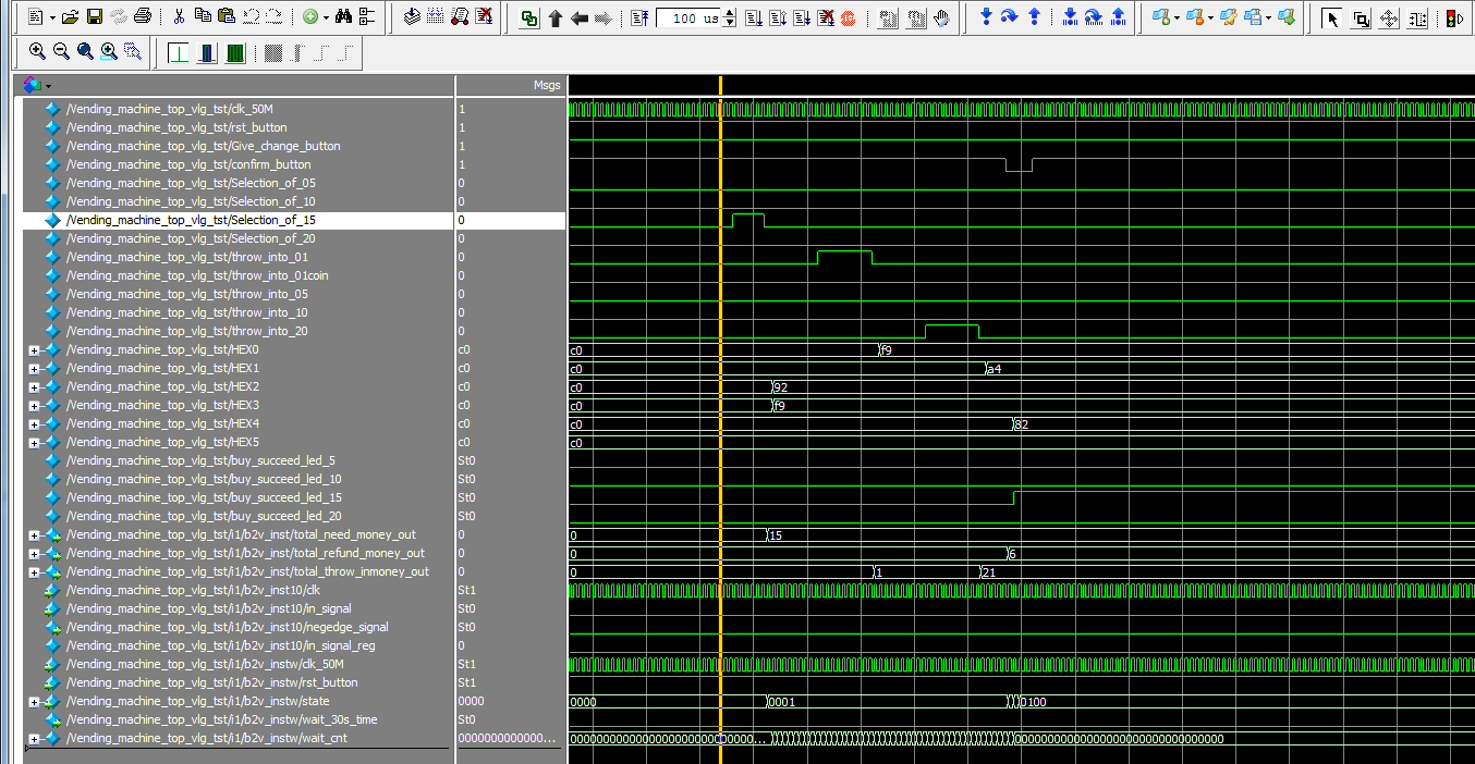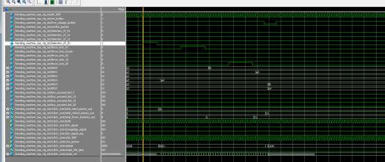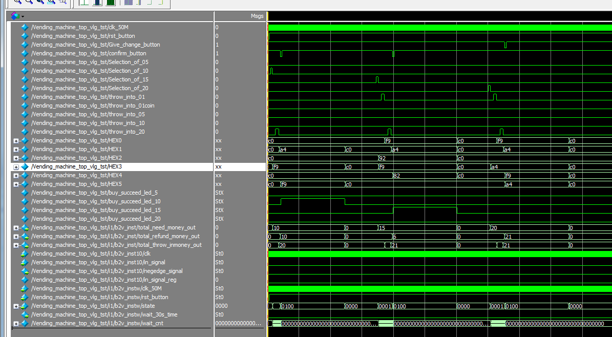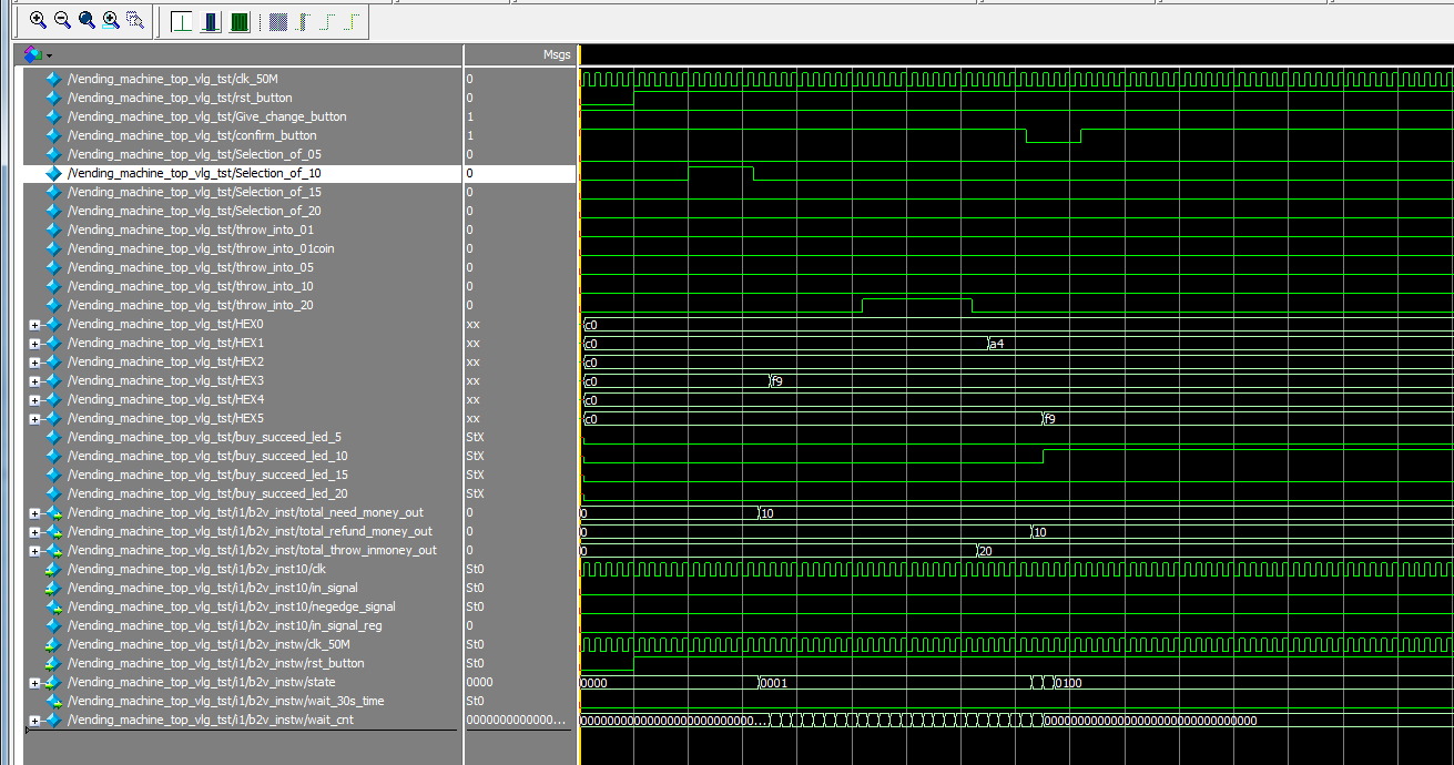 下图中,rst_button低电平复位,复位后,selection_of_10脉冲表示选中价钱为10的商品,可看见total_need_money_out信号变为10,然后throw_into_20_down脉冲表示投入20元,total_throw_inmoney_out信号变为20,然后confirm_button确认购买,低电平有效,显示找零total_refund_money_out=10。同时buy_succeed_led_10信号变为高电平,表示购买成功。