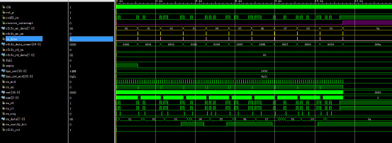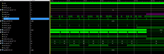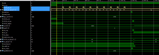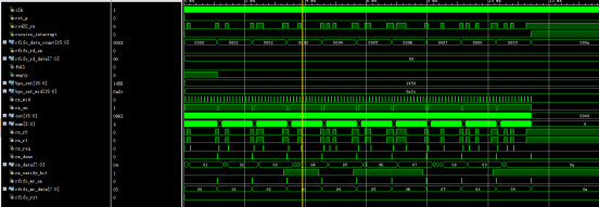 接收模块使用:rx接收的数据存于FIFO中,rfifo_wr_en为FIFO写信号,rfifo_wr_data为FIFO写数据。数据接收满32768字节后(仿真时改为10),产生接收中断信号receive_interrupt,receive_interrupt为高电平表示接收中断。要处理接收到的数据只需要通过FIFO的读接口rfifo_rd_en、rfifo_rd_data读取数据即可。具体仿真图如下: