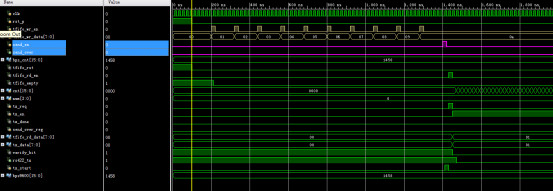 发送模块使用:先通过tfifo_wr_en和tfifo_wr_data信号将待发送的数据写入fifo中,写完后启动send_en信号(一个时钟周期高电平),将启动串口发送,所有数据发送完成后,send_over信号拉高。具体仿真图如下: