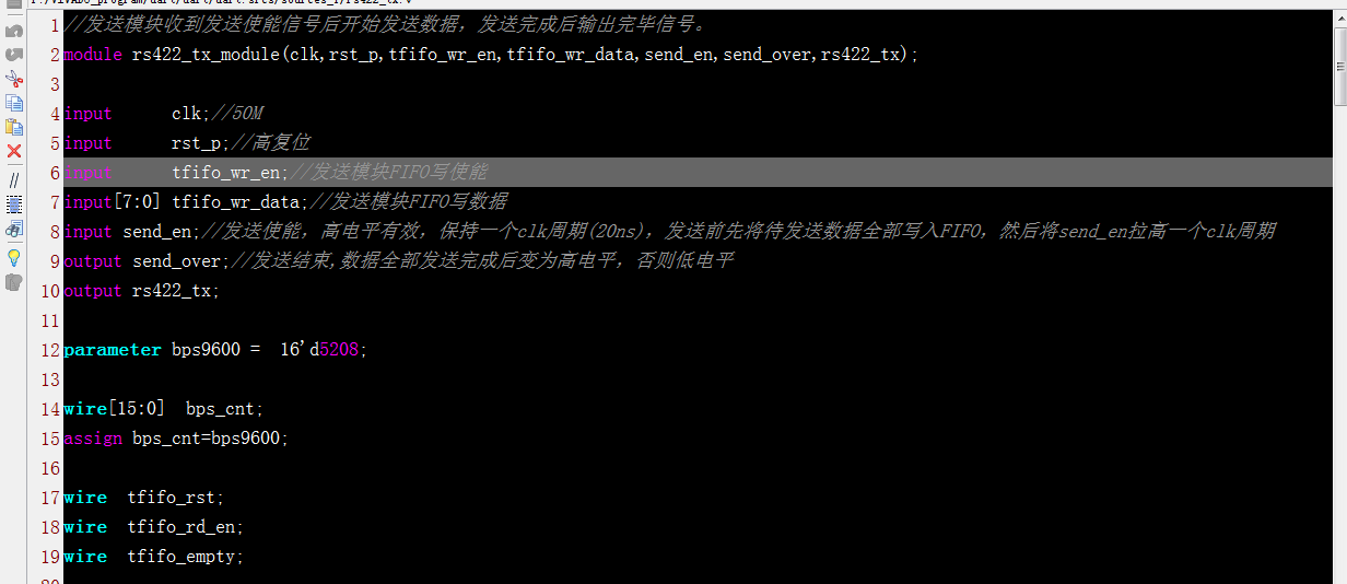 1、发送模块收到发送使能信号后开始发送数据,发送完成后输出完毕信号。数据发送使用FIFO接口