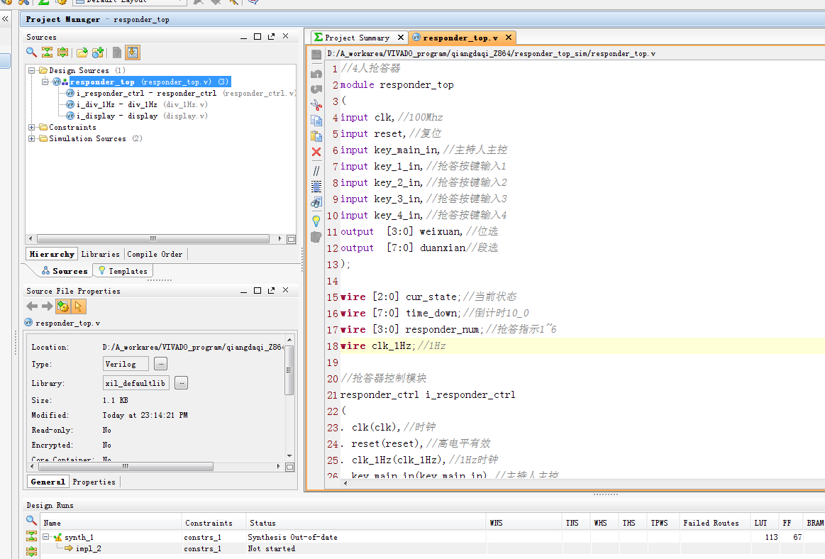 名称:4路限时抢答器设计Verilog代码VIVADO仿真