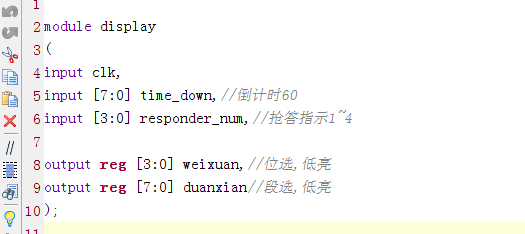//抢答器控制模坿 module?responder_ctrl ( input?clk,//时钟 input?reset,//低电平有敿 input?clk_1Hz,//1hz input?key_main_in,//主持人主掿 input?key_1_pos,//抢答按键输入1 input?key_2_pos,//抢答按键输入2 input?key_3_pos,//抢答按键输入3 input?key_4_pos,//抢答按键输入4 output?[2:0]?cur_state,//当前状态 output?[7:0]?time_down,//倒计 output?reg?[3:0]?responder_num//抢答指示1~6 ); parameter?s_idle=3'd0;//空闲状 parameter?s_start=3'd1;// parameter?s_timedowm=3'd2;//倒计 parameter?s_qiangda=3'd3;//抢答 parameter?s_end=3'd4;//抢答结束 reg?[2:0]?state=3'd0; reg?time_over=0;//倒计时结束指示 assign??cur_state=state; always@(posedge?clk?or?negedge?reset) if(~reset) state<=s_idle;//空闲 else case(state) s_idle: if(key_main_in)//主控,按键 state<=s_start;// else state<=s_idle;//空闲 s_start: state<=s_timedowm;//倒计时 s_timedowm: state<=s_qiangda;//倒计时 s_qiangda: if(key_1_pos?|?key_2_pos?|?key_3_pos?|?key_4_pos) state<=s_end;//结束 else?if(time_over==1)//倒计时 ????state<=s_end;//倒计时结束 else state<=s_qiangda;//抢答 s_end: if(key_main_in)//主控 state<=s_start;// else state<=s_end;//结束 default:state<=s_idle;//空闲 endcase //always@(posedge?clk?or?negedge?reset) //if(~reset) //beep<=0;//复位 //else?if(state==s_beep) //beep<=1;//输出报警信号 //else //beep<=0; reg?[7:0]?down_cnt=8'd5;//倒计时计敿 always@(posedge?clk) if(state==s_timedowm?||?state==s_qiangda)begin if(down_cnt==8'd0)begin down_cnt<=8'd0; time_over<=1;//倒计时 end