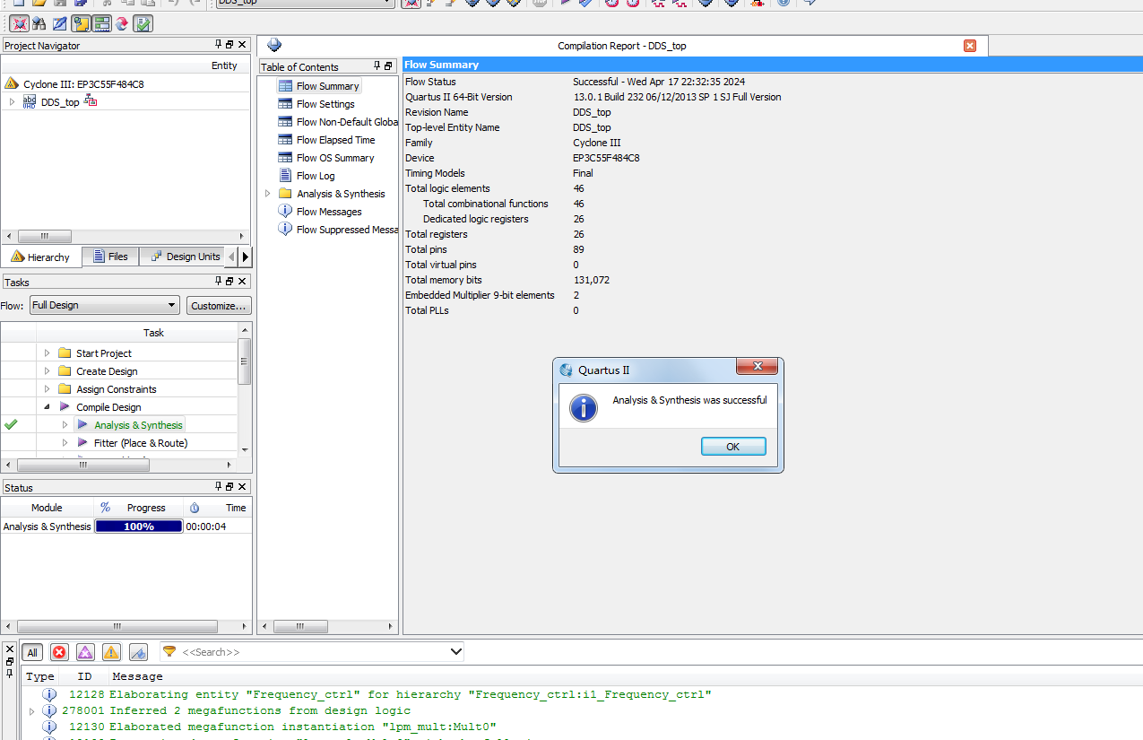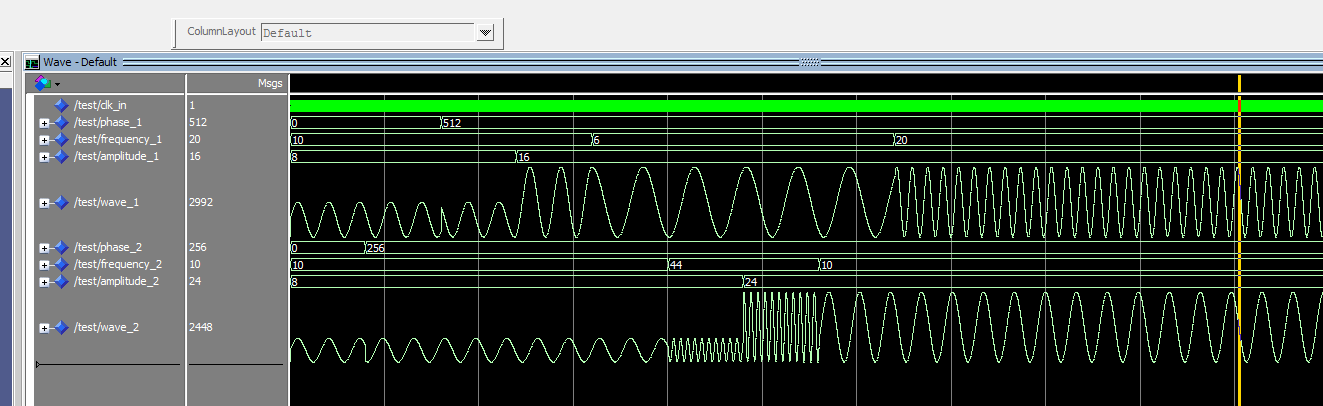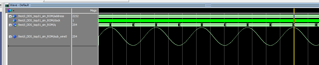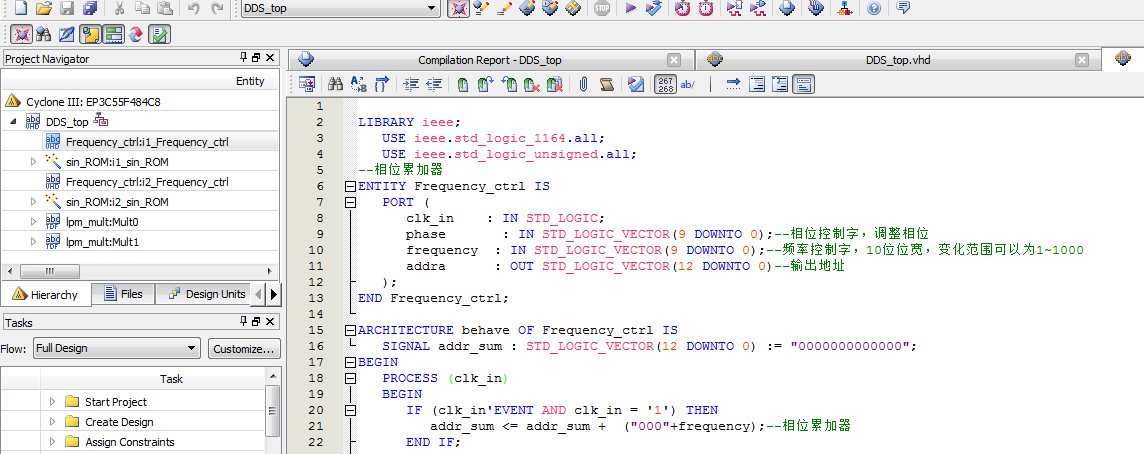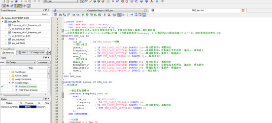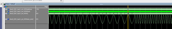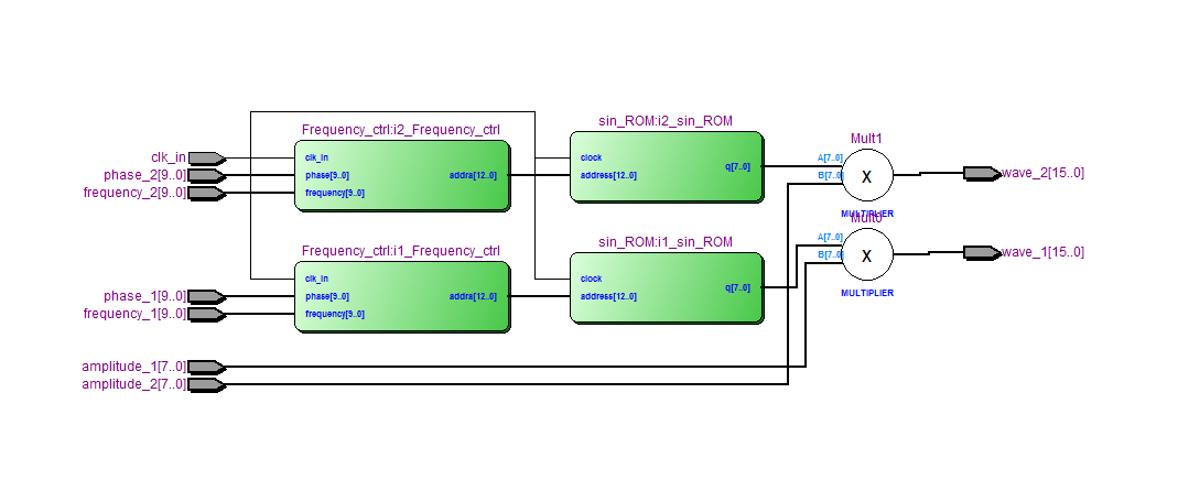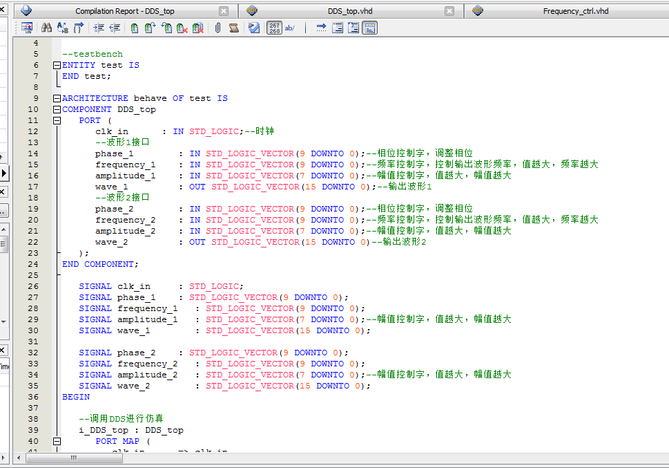 LIBRARY?ieee; ???USE?ieee.std_logic_1164.all; USE?ieee.std_logic_unsigned.all; --一个移相信号发生器,能产生两路正弦信号,正弦信号频率、幅值、相位差可调 --正弦波频率等于clk*N/2^13,clk为输入时钟,N为频率控制字frequency;2^13是因为ROM里面存储了8192个点,相位累加器位宽为13位 ENTITY?DDS_top?IS ???PORT?( ??????clk_in??????:?IN?STD_LOGIC;--时钟 --波形1接口 phase_1????????:?IN?STD_LOGIC_VECTOR(9?DOWNTO?0);--相位控制字,调整相位 ??????frequency_1????:?IN?STD_LOGIC_VECTOR(9?DOWNTO?0);--频率控制字,控制输出波形频率,值越大,频率越大 ??????amplitude_1????:?IN?STD_LOGIC_VECTOR(7?DOWNTO?0);--幅值控制字,值越大,幅值越大 wave_1?????????:?OUT?STD_LOGIC_VECTOR(15?DOWNTO?0);--输出波形1 --波形2接口 phase_2????????:?IN?STD_LOGIC_VECTOR(9?DOWNTO?0);--相位控制字,调整相位 ??????frequency_2????:?IN?STD_LOGIC_VECTOR(9?DOWNTO?0);--频率控制字,控制输出波形频率,值越大,频率越大 ??????amplitude_2????:?IN?STD_LOGIC_VECTOR(7?DOWNTO?0);--幅值控制字,值越大,幅值越大 wave_2?????????:?OUT?STD_LOGIC_VECTOR(15?DOWNTO?0)--输出波形2 ???); END?DDS_top; ARCHITECTURE?behave?OF?DDS_top?IS --例化模块 ??? --相位累加器模块 ???COMPONENT?Frequency_ctrl?IS ??????PORT?( ?????????clk_in??????:?IN?STD_LOGIC; ?????????frequency????:?IN?STD_LOGIC_VECTOR(9?DOWNTO?0); phase???????:?IN?STD_LOGIC_VECTOR(9?DOWNTO?0);--相位控制字,调整相位 ?????????addra????????:?OUT?STD_LOGIC_VECTOR(12?DOWNTO?0) ??????); ???END?COMPONENT; --ROM表 COMPONENT?sin_ROM?IS PORT ( address:?IN?STD_LOGIC_VECTOR?(12?DOWNTO?0); clock:?IN?STD_LOGIC??:=?'1'; q:?OUT?STD_LOGIC_VECTOR?(7?DOWNTO?0) ); END?COMPONENT;