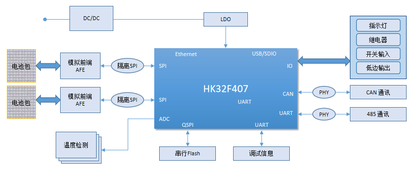 主控单元:以HK32F407 为核心,负责整个 BMS 系统的控制和管理,运行各种算法和控制逻辑,实现对电池的精确控制和管理。