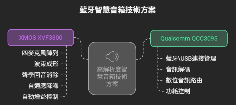 要实现这一目标,必须构建一条从声音收录、数字降噪、无线传输到最终高保真重播的完整音频链,并在性能、功耗及音质之间取得最佳平衡。本文将深入介绍如何结合Qualcomm QCC3095 蓝牙音频 SoC与XMOS XVF3800 多核DSP打造基于 I2S 数字流架构的高性能智能音箱解决方案,兼具高解析度、低失真、回声抑制与先进语音交互能力,适用于蓝牙及 USB 多平台连接。